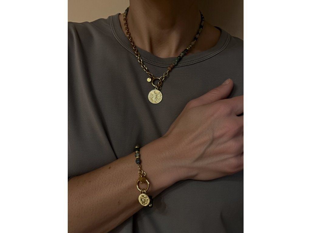 Ciemny agat z fasetami + złote elementy 18K plated. Proste zapięcie typu toggle i zawieszka w kształcie słońca.