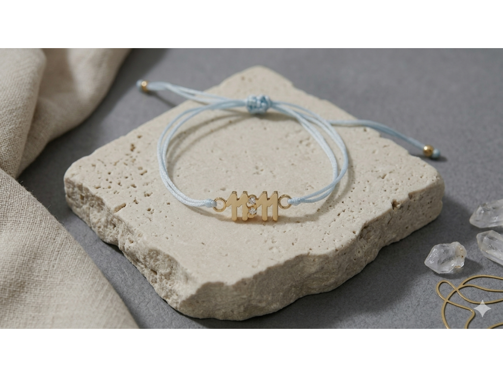 Ta bransoletka łączy delikatny sznurek w odcieniu baby blue z dominującym motywem angel numbers 11:11, uzupełnionym subtelnymi cyrkoniami.