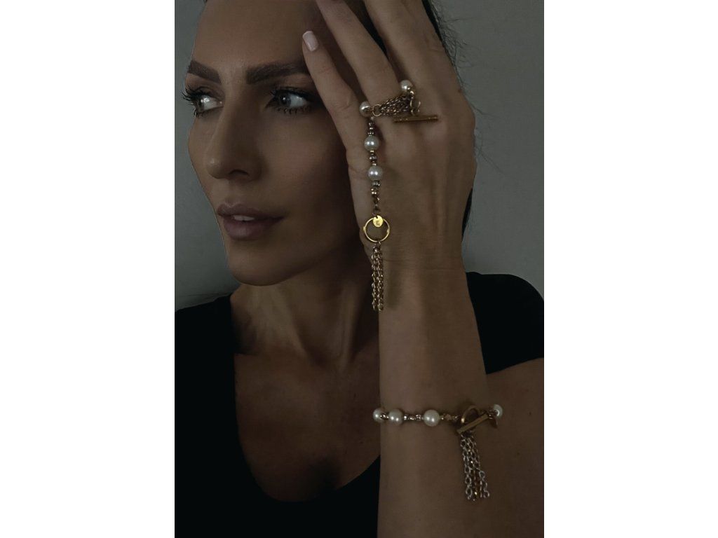 Bransoletka z perłą, która łączy złoty i srebrny łańcuszek w harmonijną całość – symbol równowagi między siłą a delikatnością, rozumem a emocjami.