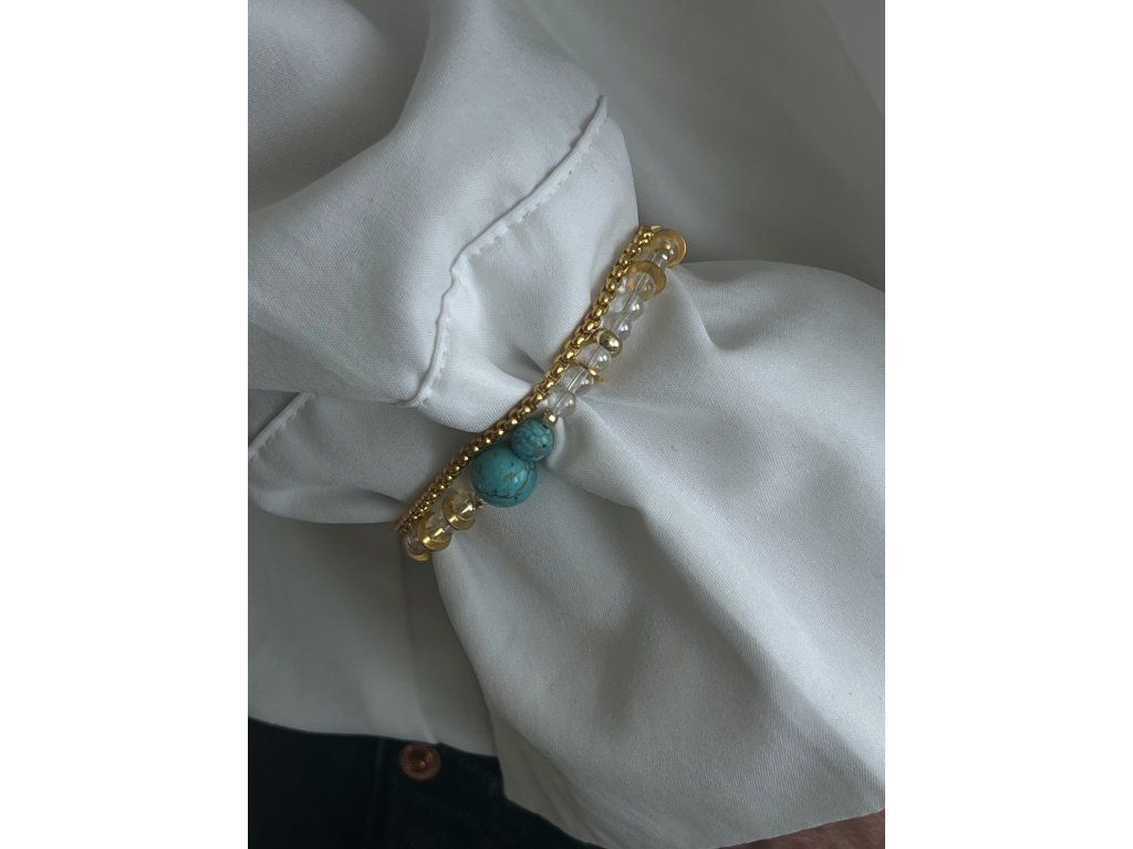 Delikatny złoty łańcuszek + drugi rząd pełen błyszczących koralików kryształowych, złotych koralików, turkusu oraz mała zawieszka szczęścia. Idealna do białej koszuli i białego t-shirtu.
