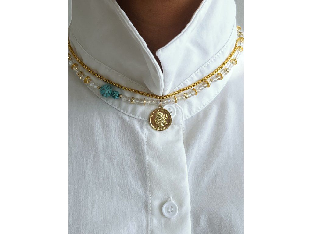 Dwurzędowy naszyjnik 18K Gold Plated z turkusem, kryształami oraz zawieszką Szczęścia.