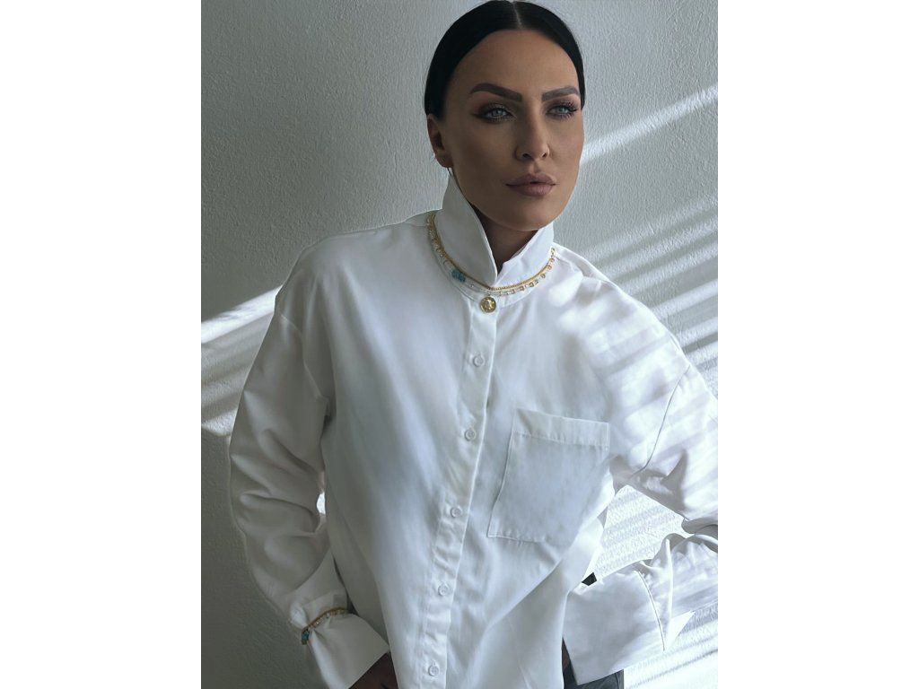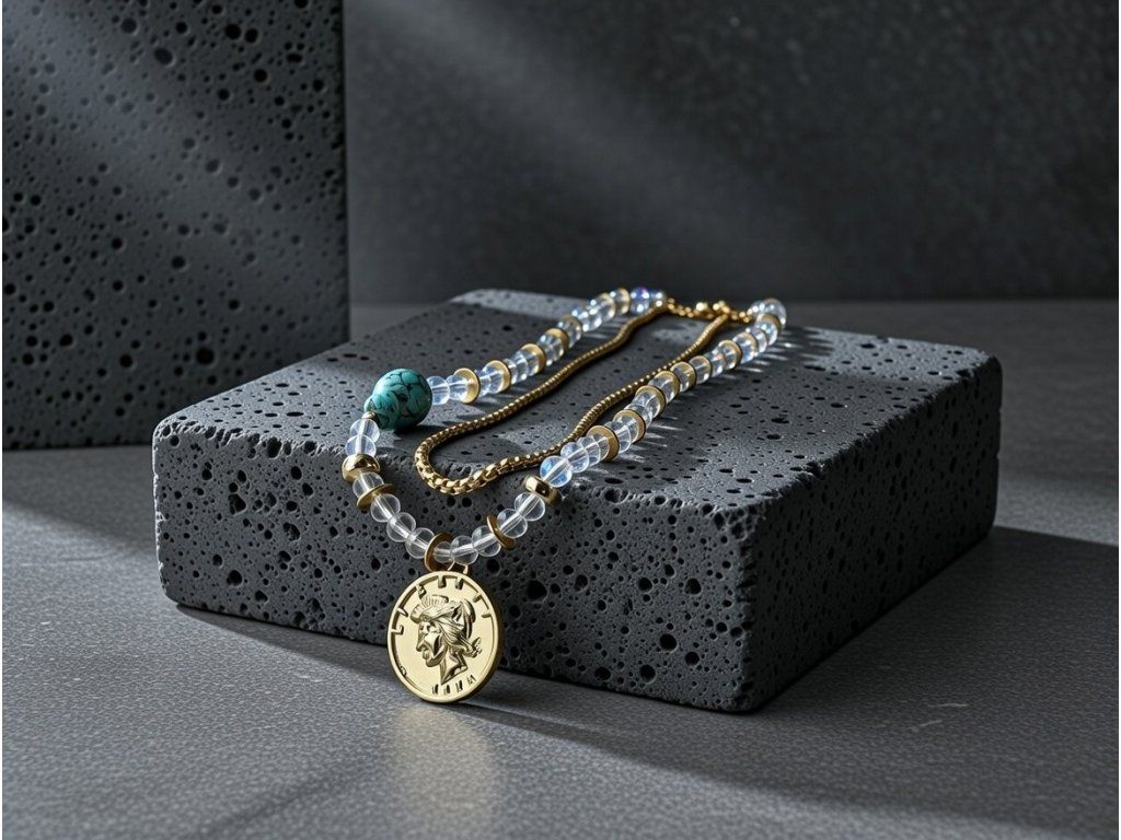 Drugi rząd: minerał turkus, złote koraliki oraz kryształowe koraliki, które pięknie kontrastują ze złotem.