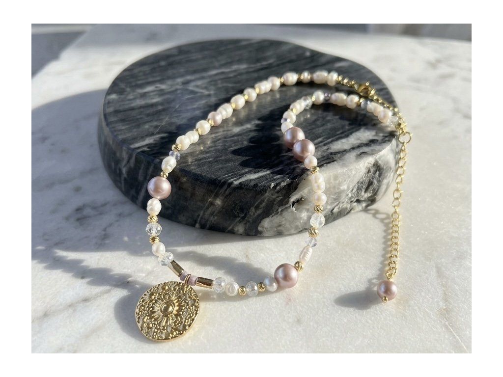 Ten wyjątkowy naszyjnik jest ucieleśnieniem luksusu i delikatności. Wykonany ręcznie z pereł rzecznych i kryształów, ozdobiony efektownymi różowymi perłami i detalami z 18-karatowego złota, stanowi nowoczesny talizman kobiecej mocy, elegancji i duchowej równowagi.